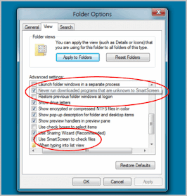 Pilihan proteksi SmartScreen terdaftar di bawah Folder Options-nya Windows 8.