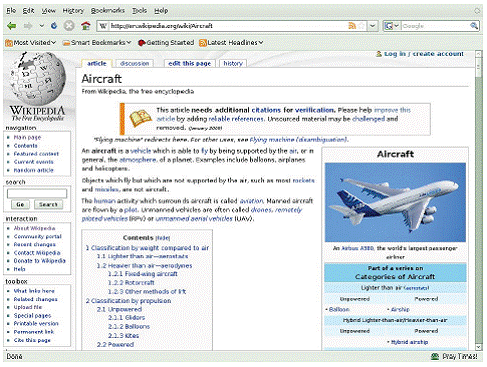 Untuk mengetahui secara umum tentang pesawat terbang, kita dapat memasukan kata kunci 'aircraft' ke Wikipedia berbahasa Inggris. Alternatif lain, kita juga dapat memasukan kata kunci 'pesawat udara' ke Wikipedia berbahasa Indonesia. Tampak pada Gambar 6.11 di-perlihatkan informasi tentang aircraft yang ada di Wikipedia berbahasa Inggris.