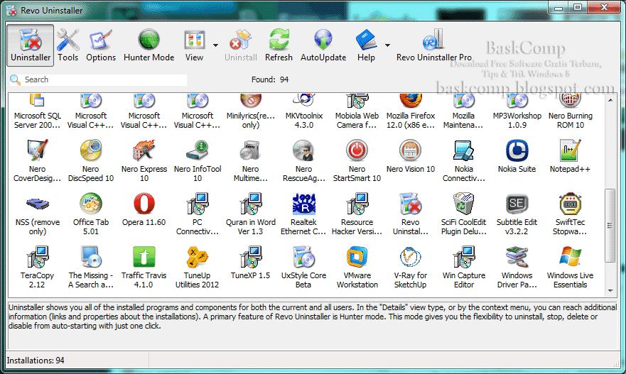 Dengan fitur "Hunter mode" uniknya, Revo Uninstaller menawarkan beberapa cara yang mudah digunakan namun sangat efektif untuk mengelola (menguninstall, menghentikan, menghapus, disable dari auto-start) dan untuk mendapatkan informasi tentang software yang diinstal dan/atau berjalan. Banyak tools tambahan yang tersedia dalam software Revo Uninstaller ini.