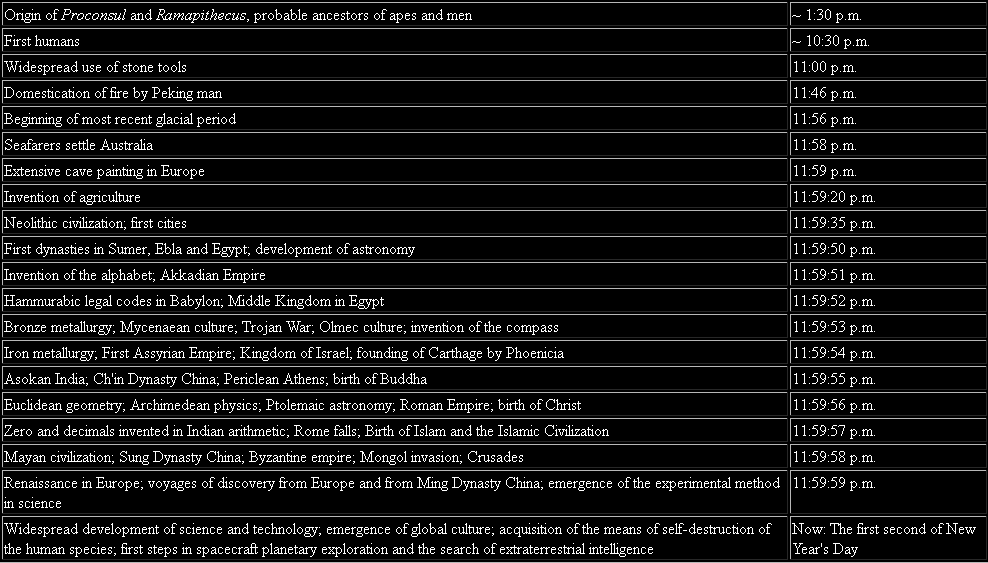 Prof. Dr. Carl Sagan dari Universitas Cornell, dalam bukunya The Dragons of Eden, mengemukakan bahwa jika usia alam semesta kita kompres menjadi satu tahun kosmis (cosmic year), maka penciptaan alam semesta berlangsung tanggal 1 Januari, galaksi Bimasakti baru terbentuk tanggal 1 Mei, tatasurya kita muncul tanggal 9 September, bumi kita yang kecil ini baru ada tanggal 14 September, makhluk hidup pertama di bumi berupa mikroorganisme bersel tunggal eksis tanggal 9 Oktober, zaman dinosaurus berlangsung dari 24 sampai 28 Desember, manusia baru tampil ke pentas sejarah pada tanggal 31 Desember pukul 23.00 tengah malam menjelang tahun baru, dan Nabi Isa Al-Masih a.s. lahir empat detik yang lalu.